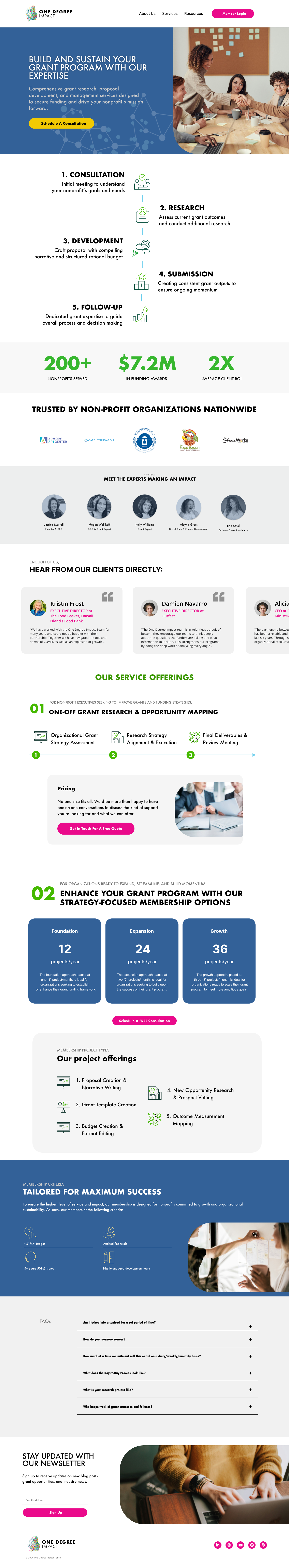 One Degree Impact, a grant services company with a successful membership model, needed to integrate a new one-off project service into their digital presence. The challenge was to effectively communicate this new grant research service alongside their existing subscription-based offerings while maintaining their brand credibility and value proposition.